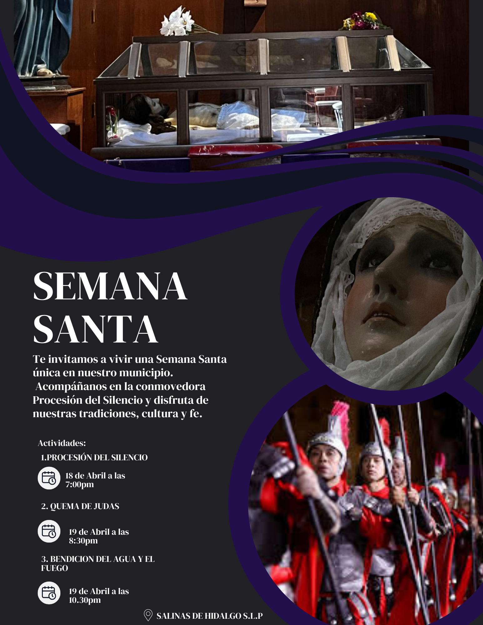 En nuestro municipio, la Semana Santa es una de las celebraciones más importantes del año. Más que una tradición, es una expresión profunda de fe y unidad comunitaria. Durante estos días, las calles se llenan de devoción, recogimiento y participación, reafirmando nuestras raíces católicas y el compromiso de mantener vivas nuestras costumbres. Es un tiempo de reflexión, encuentro y orgullo por nuestras creencias. La mayoría de los locales son participes y voluntarios en las distintas actividades en los eventos que hay, por ejemplo: